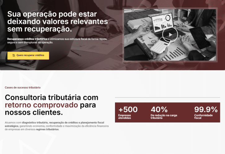 - Copy orientada à dor: impostos pagos indevidamente, caixa travado e risco fiscal